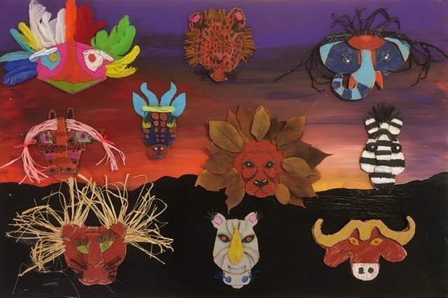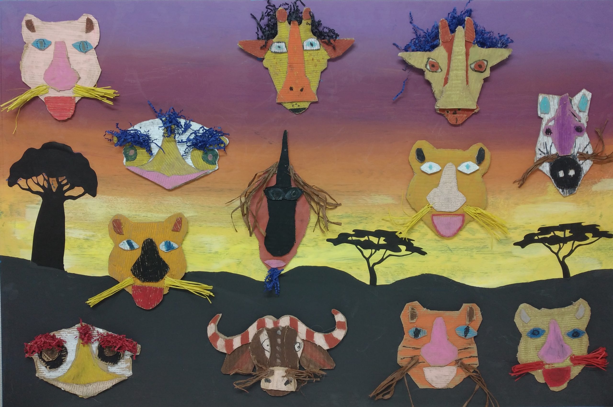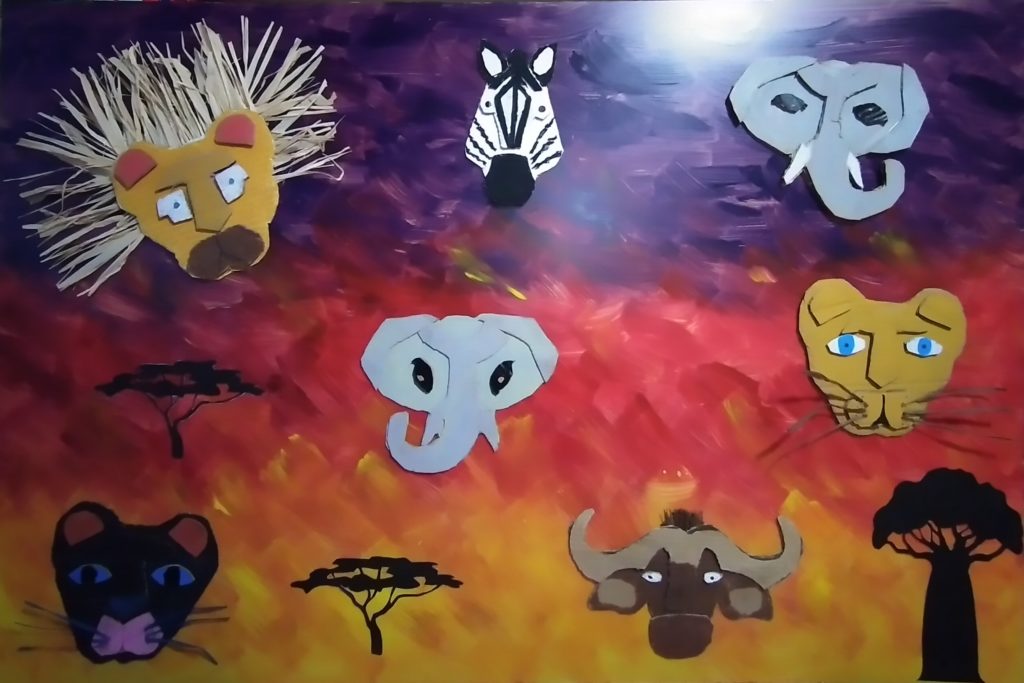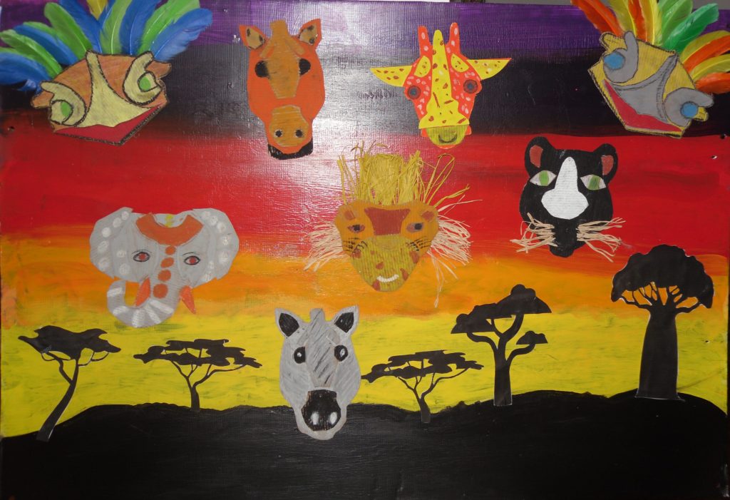 A partir de matériaux de récupération comme du carton, de la ficelle…, nos jeunes artistes en herbe ont mis en valeur des lions, des hippopotames, des girafes ou encore des zèbres sur une magnifique peinture de coucher de soleil.