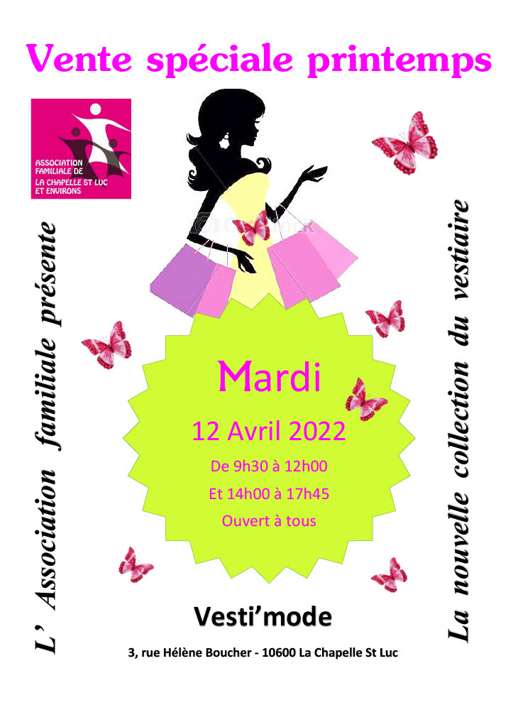 Information : la vente se déroulera le 12 avril, dans les locaux Vesti’Mode : 3 rue Hélène Boucher 10600 LA CHAPELLE-SAINT-LUC.