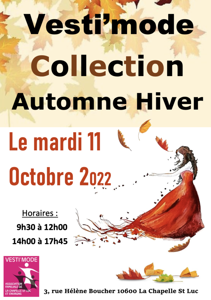 Information : la vente se déroulera le Mardi 11 Octobre 2022, dans les locaux Vesti’Mode : 3 rue Hélène Boucher 10600 LA CHAPELLE-SAINT-LUC.